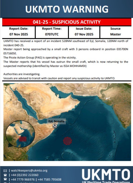 وأفادت هيئة العمليات البحرية التجارية التابعة للبحرية البريطانية بأنها تلقت تقريراً جديداً عن هجوم على سفينة شحن قبالة سواحل الصومال.